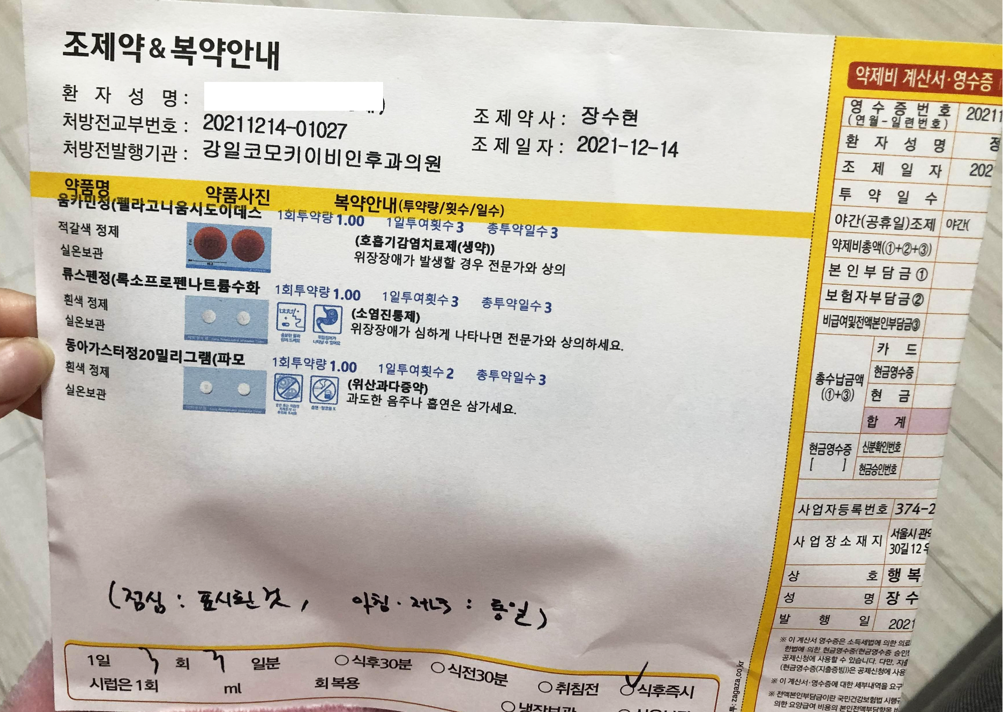일반적으로 병원진료를 봤을때와 마찬가지인 약봉지와 약이 같이 들어있다.